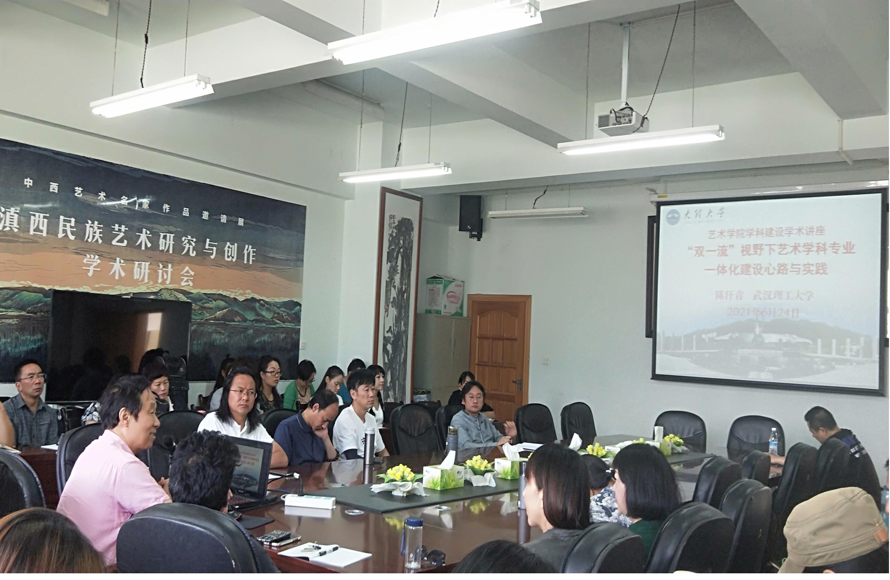 2021年6月24日,艺术学院 “双一流”专业建设和艺术硕士点建设工作研讨会在艺术楼会议室举行。会议由赵全胜院长主持。武汉理工大学教授、设计学院原院长、教育部艺术专业学位研究生教育指导委员会委员陈汗青教授受邀到我院进行艺术学科建设指导。艺术学院全体教师参加了本次讨论会议。